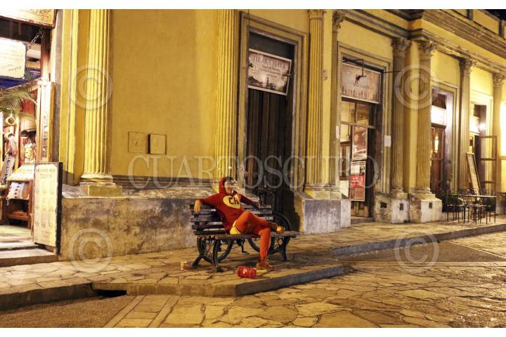 SAN CRISTOBAL DE LAS CASAS, CHIAPAS, 01MARZO2014.- Un hombre disfrazado de Chapulín Colorado descansa en una banca en el andador Guadalupe de esta ciudad mientras espera a tomarse una foto con los turistas que vienen a visitar la ciudad y así obtener algo de dinero. FOTO: ELIZABETH RUIZ /CUARTOSCURO.COM