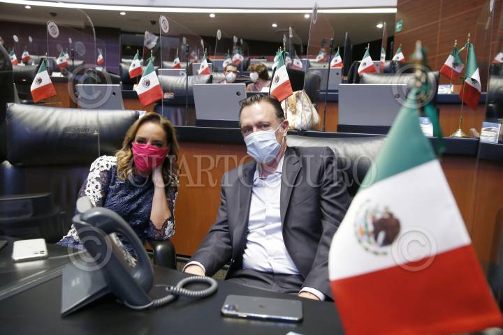 Los senadores Claudia Ruiz Massieu, PRI, y Mauricio Kuri, PAN, conversan en la sesión.