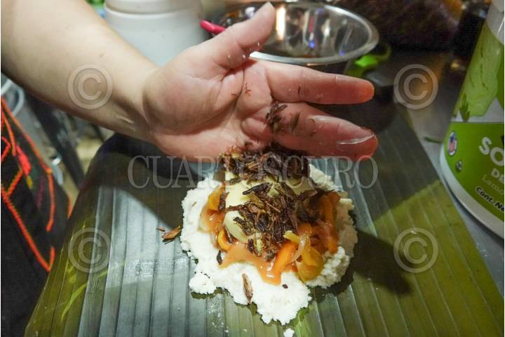 Elaboración de tamales de chapulines hechos a base de hoja de plátano en la cocina "Doña Vero"