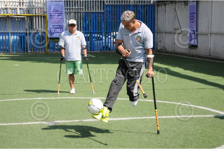 Dos jugadores con amputaciones en sus piernas de los equipos "Chapulines" y "Pumas Reto", respectivamente, disputan un balón durante un partido en el Deportivo Valle Escandón