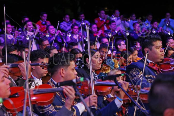 Distintos mariachis, de diversas agrupaciones, participan en el performance denominado “200 años de Jalisco, 200 Mariachis”, esto en el marco del 30 Encuentro Internacional del mariachi y la Charrería.