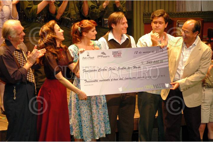 MÉXICO, D.F., 13MARZO2010.- Los actores Fernando Lujan y Silvia Navarro hacen entrega de un cheque de ayuda para Haití a un representante de la fundación Carlos Slim al termino de la obra Todos Eran Mis Hijos que la noche de ayer cumplió 100 representaciones de éxito en el teatro Helénico. FOTO: RODOLFO ANGULO/CUARTOSCURO.COM