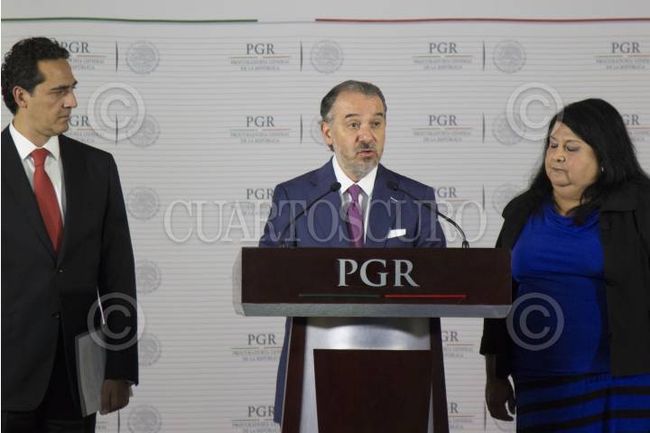 CIUDAD DE MÉXICO, 30NOVIEMBRE2016.- Alberto Díaz Beltrán, titular de la Subprocuraduría Jurídica de Asuntos Internacionales, Raúl Cervantes Andrade, físcal general de la República, y Clementina Guerrero, titular de la Secretaría de Finanzas y Planeación del Gobierno de Veracruz durante la conferencia de prensa para anunciar el pago de 250 millones de pesos al estado de Veracruz, esto tras la recuperación de 421 mdp desviados por el gobernador prófugo Javier Duarte. FOTO: GALO CAÑAS /CUARTOSCURO.COM