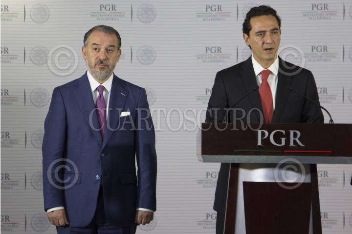 CIUDAD DE MÉXICO, 30NOVIEMBRE2016.- Raúl Cervantes Andrade, físcal general de la República, y Alberto Díaz Beltrán, titular de la Subprocuraduría Jurídica de Asuntos Internacionales, durante la conferencia de prensa para anunciar el pago de 250 millones de pesos al estado de Veracruz, esto tras la recuperación de 421 mdp desviados por el gobernador prófugo Javier Duarte. FOTO: GALO CAÑAS /CUARTOSCURO.COM