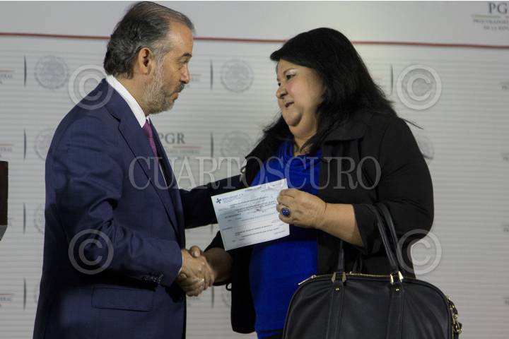 CIUDAD DE MÉXICO, 30NOVIEMBRE2016.- El procurador general de la República Raúl Cervantes Andrade y Clementina Guerrero, titular de la Secretaría de Finanzas y Planeación del Gobierno de Veracruz durante la conferencia de prensa para anunciar el pago de 250 millones de pesos al estado de Veracruz, esto tras la recuperación de 421 mdp desviados por el gobernador prófugo Javier Duarte. FOTO: GALO CAÑAS /CUARTOSCURO.COM