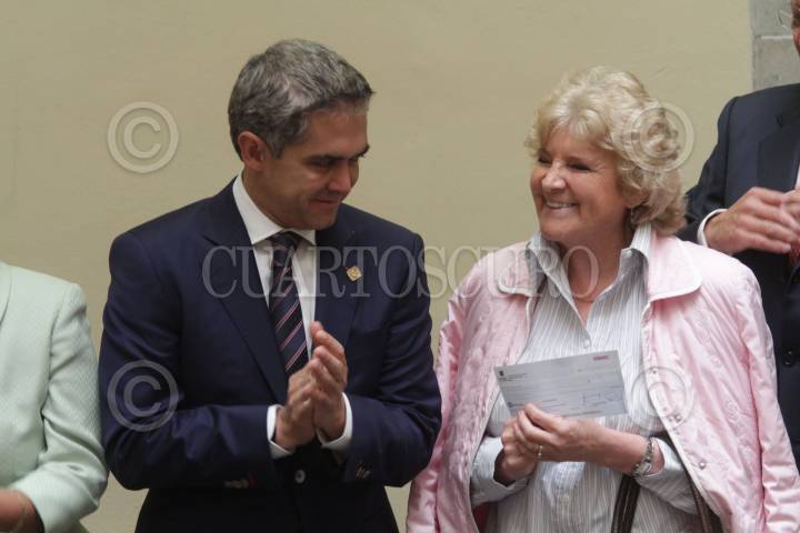 CIUDAD DE MÉXICO, 16NOVIEMBRE2017.- Gabriela García Acoltzi, coordinadora del programa "Somos Mexicanos" del Instituto Nacional de Migración (INM), y Miguel Ángel Mancera, Jefe de Gobierno, durante la ceremonia de entrega de ayuda económica del Fondo de Apoyo a Migrantes, en el Centro de Formación Docente y Escuela para Padres. FOTO: MOISÉS PABLO /CUARTOSCURO.COM