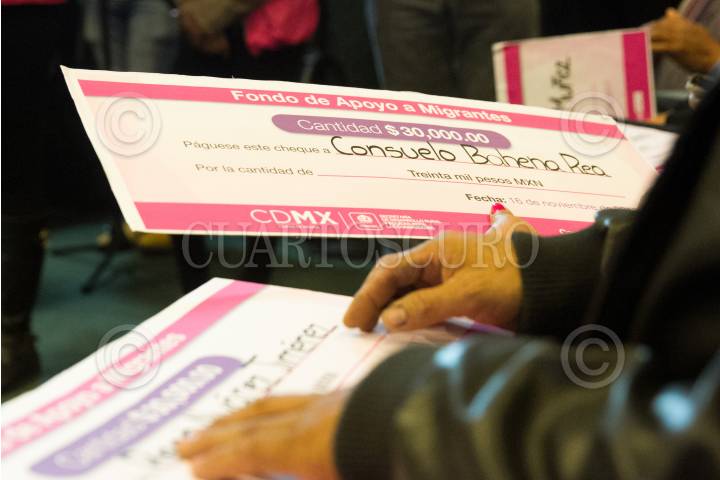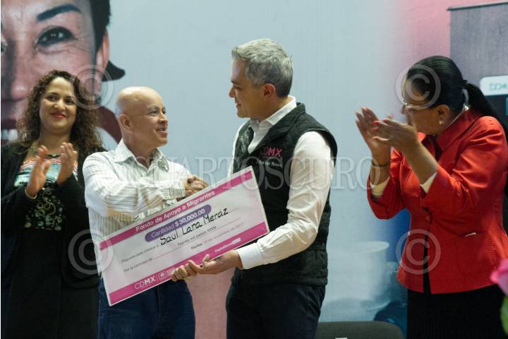 CIUDAD DE MÉXICO, 16NOVIEMBRE2017.- Saúl Lara Meraz, mexicano que vivió cerca de 40 años en Estados Unidos y que fue deportado por una falta administrativa que cometió hace doce años, recibió un cheque de ayuda del Fondo de Apoyo a Migrante, la ceremonia fue presidida por Miguel Ángel Mancera, Jefe de Gobierno. FOTO: MOISÉS PABLO /CUARTOSCURO.COM