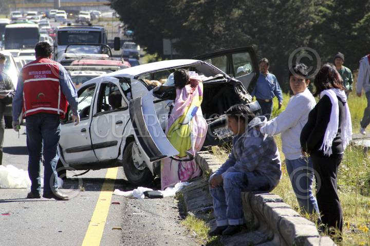 LA MARQUESA, ESTADO DE MÉXICO., 23OCTUBRE2011.- Un choque entre un chevy color blanco y un autobús de pasajeros dejo como saldo dos personas muertas, entre ellas una menor de edad. Los pasajeros del vehículo compacto formaban parte de una peregrinación de taxistas que se dirigía a Chalma, los hechos ocurrieron en el kilómetro 33 de la autopista México Toluca, a la altura de la marquesa. FOTO: LUIS CARBAYO/CUARTOSCURO.COM