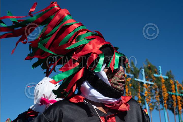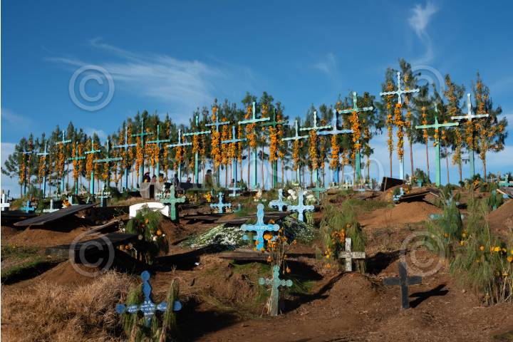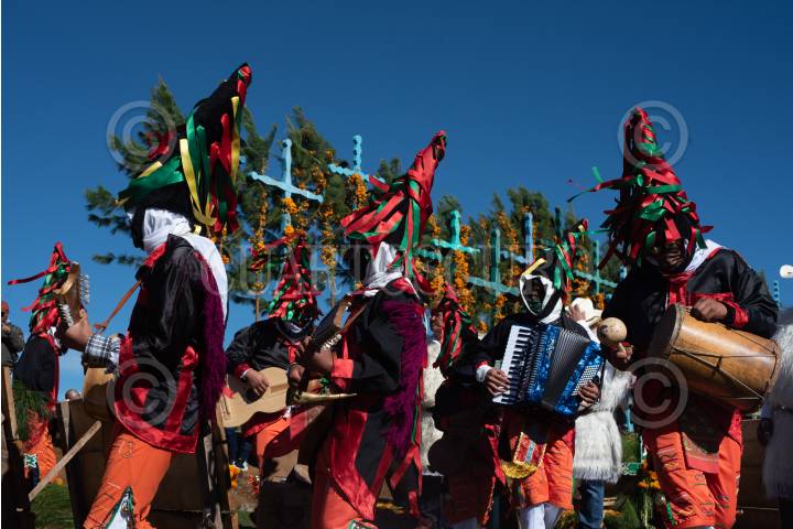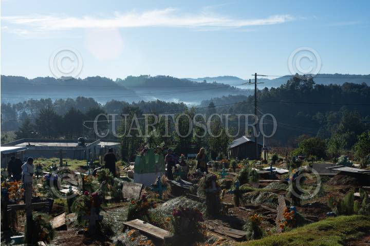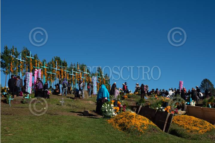 Pobladores del paraje Romerillo celebran la llegada de sus santos difuntos en el panteón uno de los panteones más emblemáticos de la región, adornado con 22 cruces monumentales representando a las comunidades del municipio.