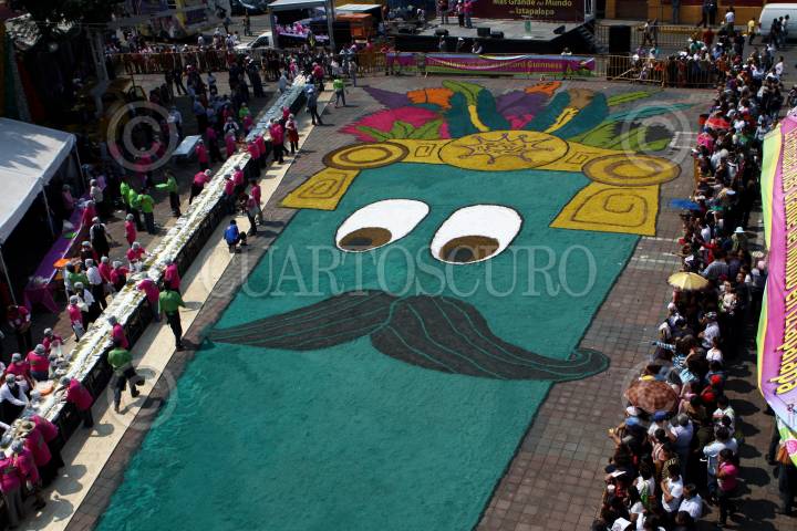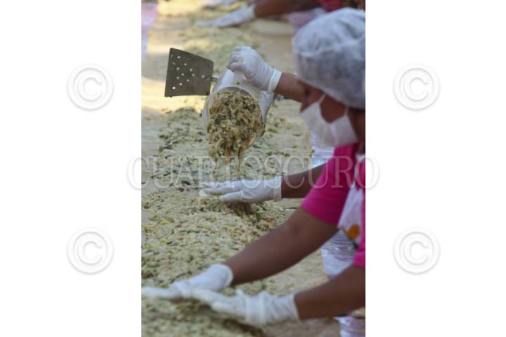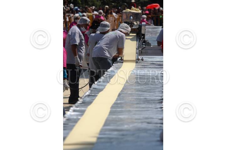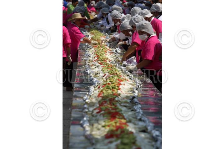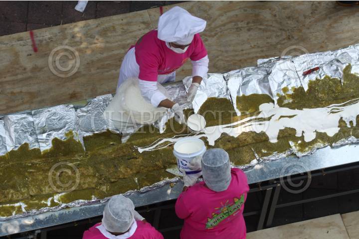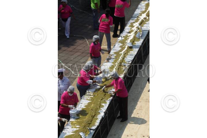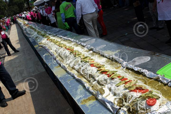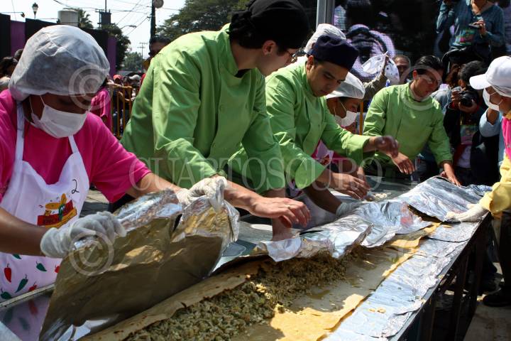 MÉXICO, D.F., 17OCTUBRE2010.- Cientos de voluntarios realizaron la Enchilada mas Grande del Mundo la cual rompió el Record Guinness con 70 metros de longitud, 30 centímetros de diámetro y una tonelada 416 kilogramos de peso; para su elaboración se utilizaron 180 litros de salsa verde y 600 kilos de relleno de pollo con calabacitas y chilacas; dicho evento se realizo en el marco de la Feria de la Enchilada que se realiza hasta el día de hoy en la explanada delegacional de Iztapalapa. FOTO: RODOLFO ANGULO/CUARTOSCURO.COM