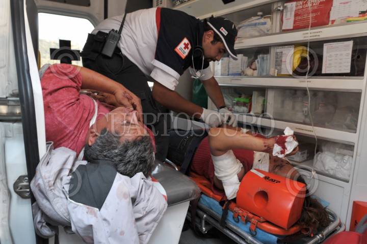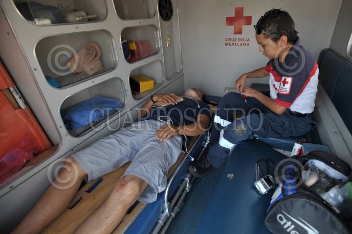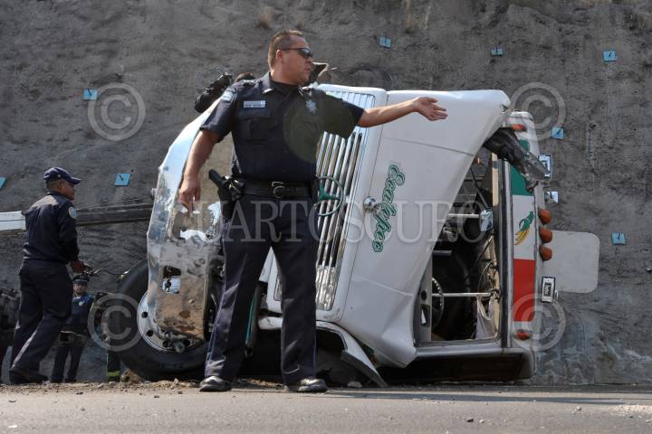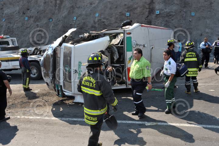 MÉXICO, D.F., 30MAYO2010.- Cinco personas resultaron lesionadas, al volcar el autobús de la línea Indios Verdes Santa Clara sobre la Autopista México-Pachuca, a la altura del Acueducto de Guadalupe en la colonia Santa Isabel Tola por lo que acudieron varias unidades de Cruz Roja de Lázaro Cárdenas para la atención y traslado de los lesionados, mientras el lugar fue abanderado por elementos de la Policía Federal. FOTO: LUIS CARBAYO/CUARTOSCURO.COM