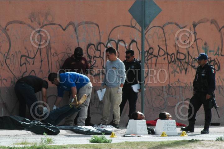 CIUDAD JUAREZ, CHIUAHUA, 28JULIO2010.- Dos sujetos, fueron encontrados decapitados en el fraccionamiento Hacienda de las Torres en las calles Desierto de Gobi y Desierto de Siria, aun costado de sus cuerpos, se encontraron sus cabezas sobre una hielera que contenía los siguientes mensajes, "soy carjacking y soy de La Línea y azteca" y "soy secuestrador y soy azteca". Hasta el momento, continúan las investigaciones para conocer los nombres de las personas. FOTO: NACHO RUÍZ/CUARTOSCURO.COM