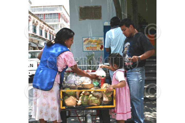 CHILPANCINGO GUERRERO, 14MAYO2008.- Una niña acompañada de su padre compra agua de coco para refrescarse un poco del intenso calor que se ha sentido en los últimos días en la capital del estado. FOTO: OSCAR ALVARADO/CUARTOSCURO.COM