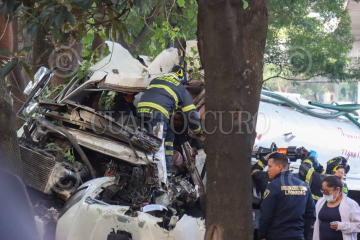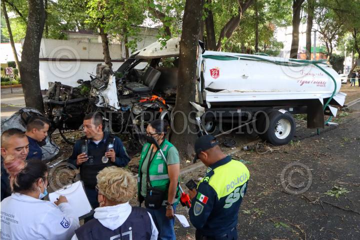 CIUDAD DE MÉXICO, 11JUNIO2024.- Una pipa repartidora de agua potable se estrelló contra varios árboles con un saldo de dos personas muertas y una herida de gravedad. Los hechos en la lateral de Viaducto Tlalpan, casi con avenida San Fernando, en la colonia El Arenal. Bomberos trabajaron por una hora para recuperar el cuerpo del chófer de los fierros retorcidos de la unidad. FOTO: ROGELIO MORALES/CUARTOSCURO.COM