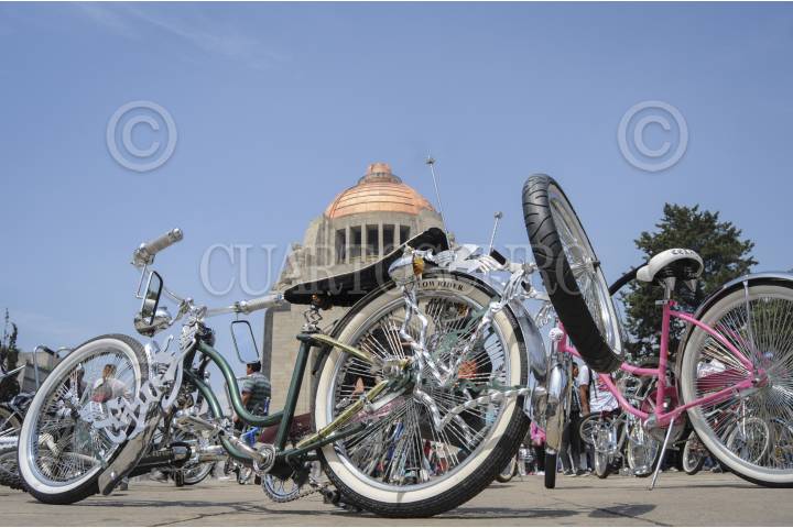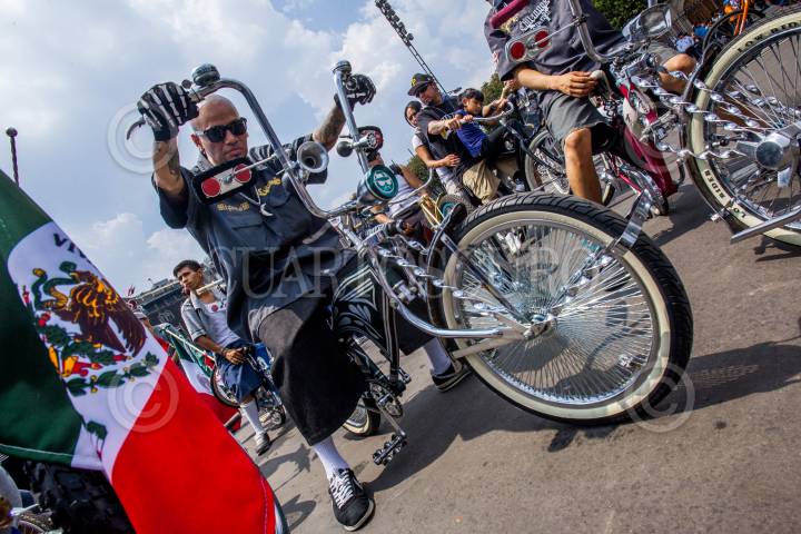 CIUDAD DE MÉXICO, 09SEPTIEMBRE2018.- Ciclistas y automotores del grupo "Chilangos Lowbike" realizaron una rodada del zócalo a la avenida Reforma, para dar a conocer el movimiento "Low Rider" en el área metropolitana. Sus miembros proceden de diversas colonias del Estado de México y la CDMX. La cultura Low Rider fue una forma de manifestación de la cultura chicana (cultura mexicana-estadounidense) que poco a poco fue permeando en la cultura afroamericana y otras en general, en la cual se modificaban coches clásicos y bicicletas, como una forma de vivir y manifestarse ante la sociedad. FOTO: JUAN PABLO ZAMORA /CUARTOSCURO.COM