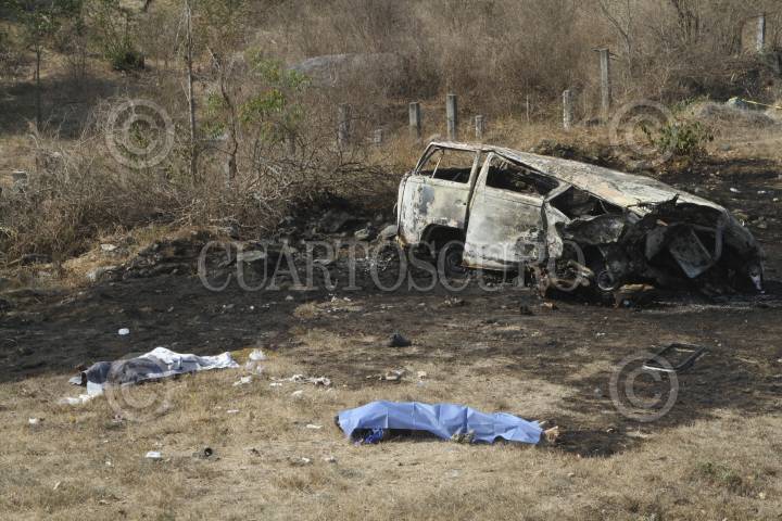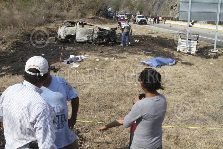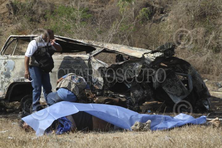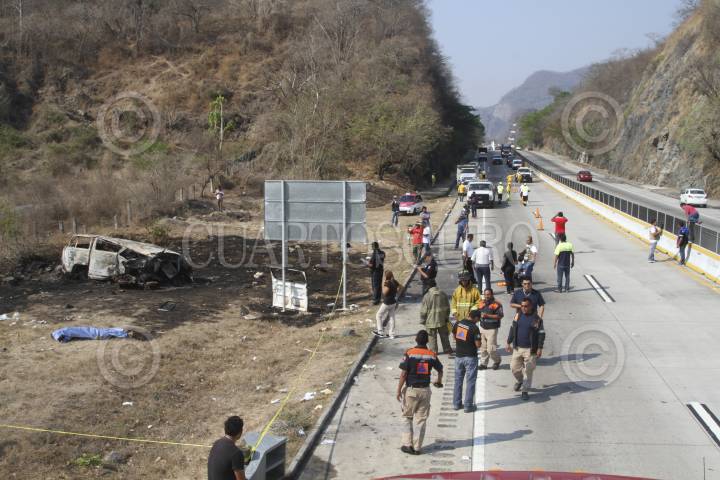 CHILPANCINGO, GUERRERO, 20ABRIL2017.- Se registró un choque automovilístico en el kilómetro 325+800 de la autopista del Sol México-Acapulco, que dejó como saldo 4 muertos y 7 personas lesionados. Los hechos sucedieron en el crucero de Tierra Colorada y Puente del Río Papagayo, en el percance estuvieron involucrados un tráiler de la marca Kenworth, color blanco con azul placas de circulación 416-XB-Z del Servicio Público Federal, el conductor se dio a la fuga después de impactar por alcance a una combi de la marca Volkswagen placas HSY -51 -17 del Estado de México, la cual se salió de la carretera y posteriormente se incendió, dejando como saldo preliminar 4 personas fallecidas y 7 lesionadas, trasladadas al hospital Magallanes de Acapulco. FOTO: BERNANDINO HERNÁNDEZ /CUARTOSCURO.COM