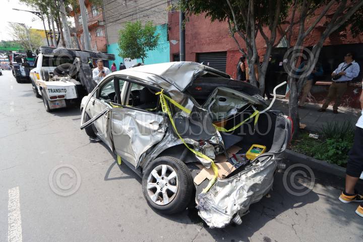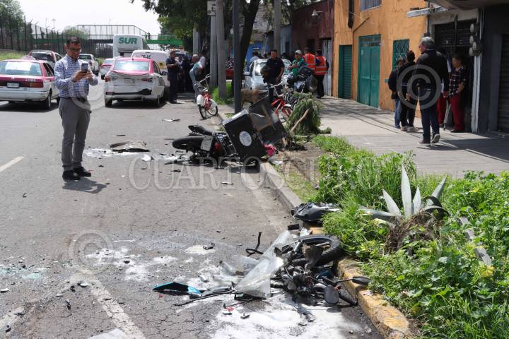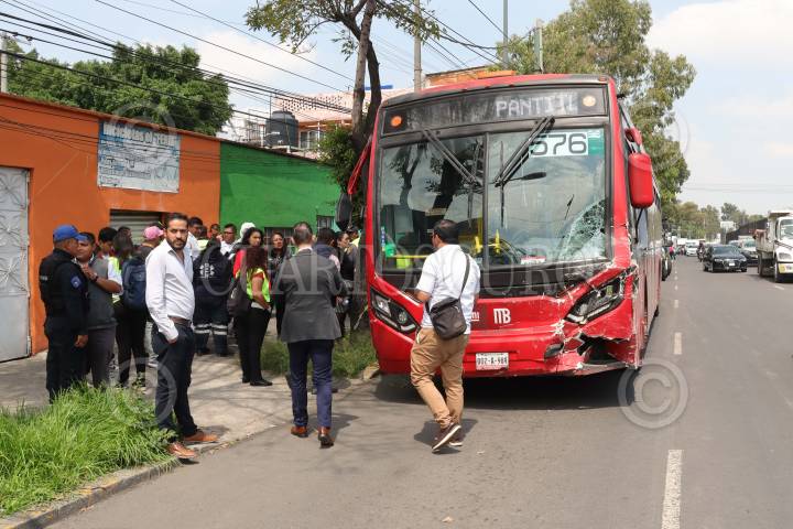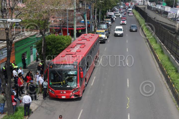 CIUDAD DE MÉXICO, 27AGOSTO2024.- Un Metrobús que se quedó sin frenos provocó una carambola, con saldo de varios carros y motos chocadas, pero ninguna víctima de gravedad. Los hechos en Eje 1 Norte y Santos Dumon, colonia Aviación Civil, Alcaldia Venustiano Carranza. FOTO: ROGELIO MORALES/CUARTOSCURO.CON