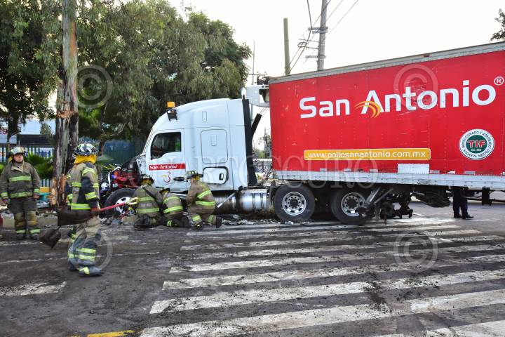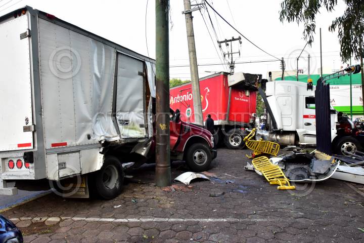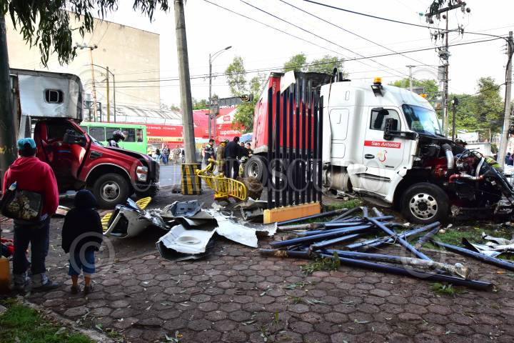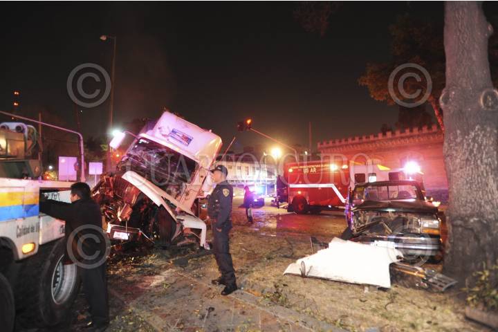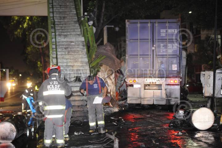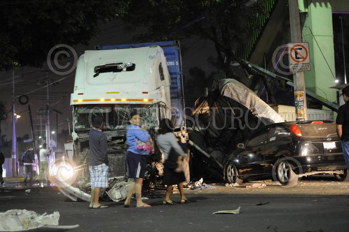 MÉXICO, D.F., 04ABRIL2013.- Un tráiler se impacto contra un puente peatonal, un puesto metálico, un auto estacionado y un poste de las cámaras de seguridad de la SSP en el cruce de Eje 5 Norte y San Pablo de la colonia san Pablo Xalpa, delegación Azacapotzalco. El conductor, logró darse a la fuga dejando su camión destrozado. FOTO: LUIS CARBAYO /CUARTOSCURO.COM