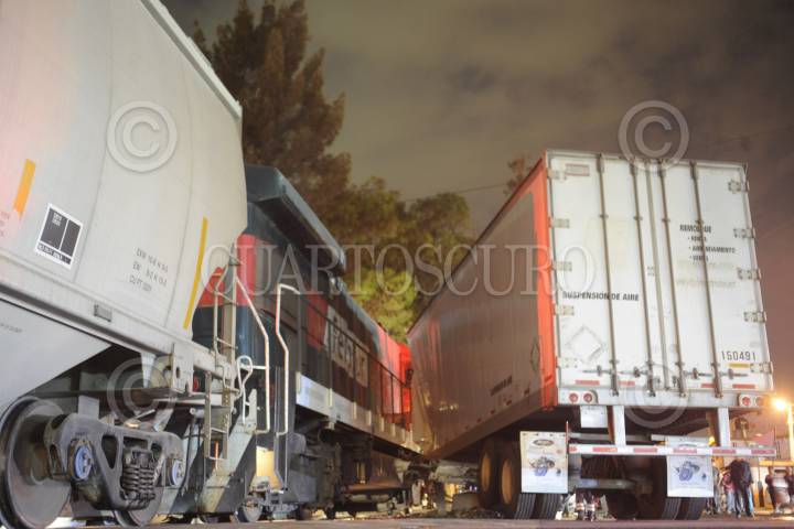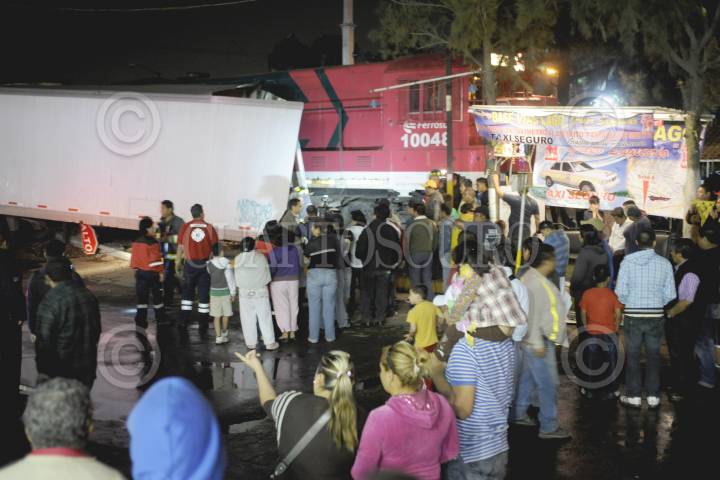 NEZAHUALCOYOTL, ESTADO DE MÉXICO, 05ABRIL2013.- Un tráiler es partido a la mitad al ser arrastrado unos 50 metros por el ferrocarril, en el cruce de Ferrocarril del Sur y Carretera Peñón Texcoco en Ciudad Lago. Del accidente, no se reportaron lesionados. FOTO: LUIS CARBAYO /CUARTOSCURO.COM