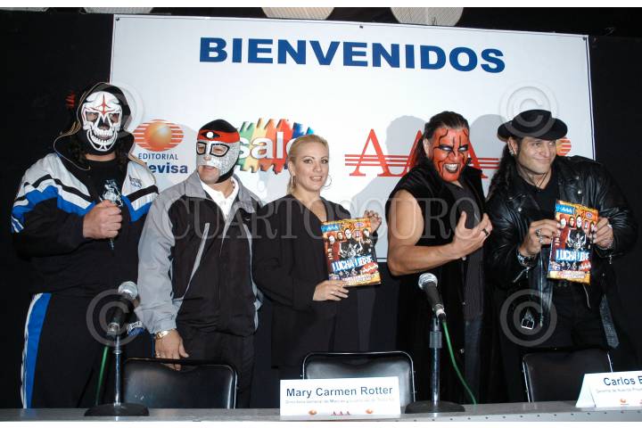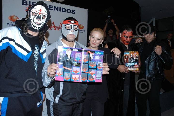 MÉXICO, D.F. 11SEPTIEMBRE2006.- Los luchadores de la AAA, La Parka, Octagón, Estrellita y Cibernético acudieron a promocionar el álbum de estampillas que saldrá a la venta en los próximos días en las instalaciones de Televisa Chapultepec. FOTO: Iván Stephens/CUARTOSCURO.COM