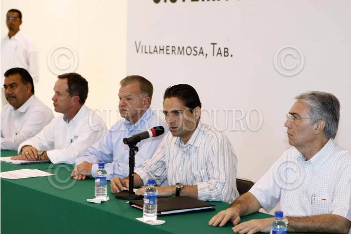 VILLAHERMOSA, TABASCO, 12FEBRERO2008.- En el marco de la Semana Nacional de Protección Civil, el gobernador tabasqueño Andres Granier Melo y el Secretario de Gobernación Juan Camilo Mouriño Terrazo ofrecieron una rueda de prensa en el hangar de gobierno. FOTO: MARCO POLO GUZMÁN HERNÁNDEZ/CUARTOSCURO.COM