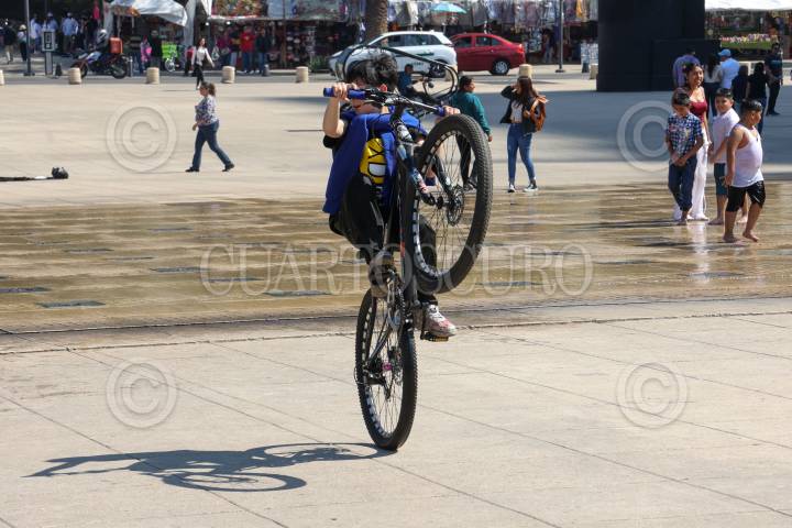 CIUDAD DE MÉXICO, 26ENERO2025.- Un joven muestra sus habilidades sobre su bicicleta haciendo un caballito en la explanada del Monumento a la Revolución. FOTO: MOISÉS PABLO/CUARTOSCURO.COM