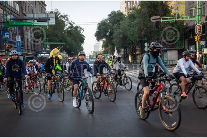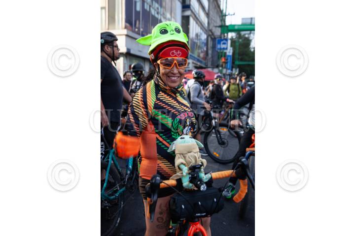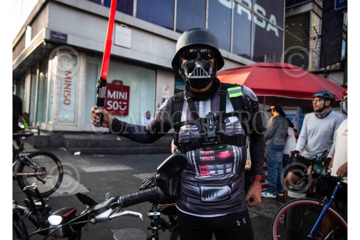 CIUDAD DE MÉXICO, 04MAYO2025.- Como parte de la meta rodada donde de distintas ciudades salen grupos ciclistas, deportistas salieron en punto de las 7 de la mañana de la torre latinoamericana. Aprovechando el día de la saga Starwars algunos ciclistas vistieron o customizaron sus bicicletas con la temática. FOTO: ANDREA MURCIA /CUARTOSCURO.COM