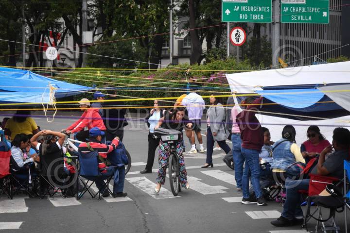 CIUDAD DE MÉXICO, 28MAYO2025.- Una ciclista evade las cuerdas que sostienen las carpas del bloqueo que maestros de la Coordinadora Nacional de Trabajadores de la Educación (CNTE) sostienen la altura de Paseo de la Reforma, en exigencia de derogar la ley del ISSSTE de 2007; aumento salarial y homologación de sus prestaciones. FOTO: MARIO JASSO/CUARTOSCURO.COM