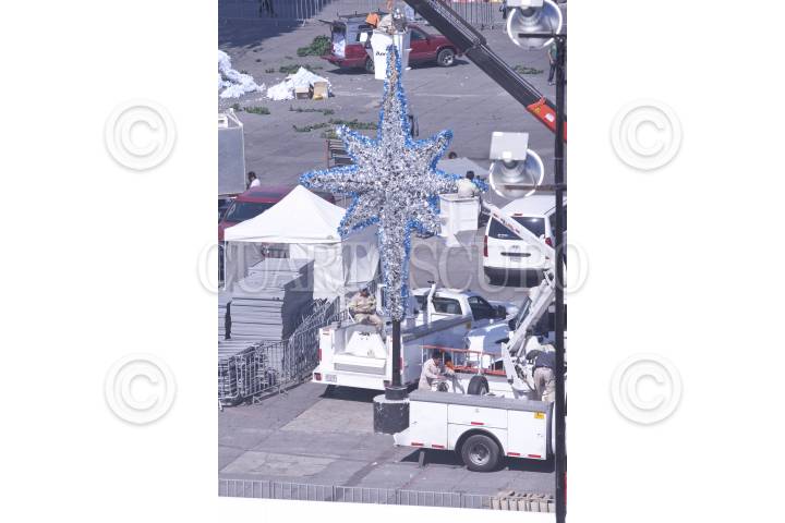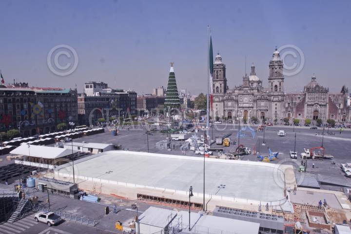 MÉXICO D.F., 29NOVIEMBRE2011.- Trabajadores continúan con los trabajos para instalar la pista de hielo y demás atracciones decembrinas en el Zócalo de la ciudad de México. FOTO: ISAAC ESQUIVEL/CUARTOSCURO.COM