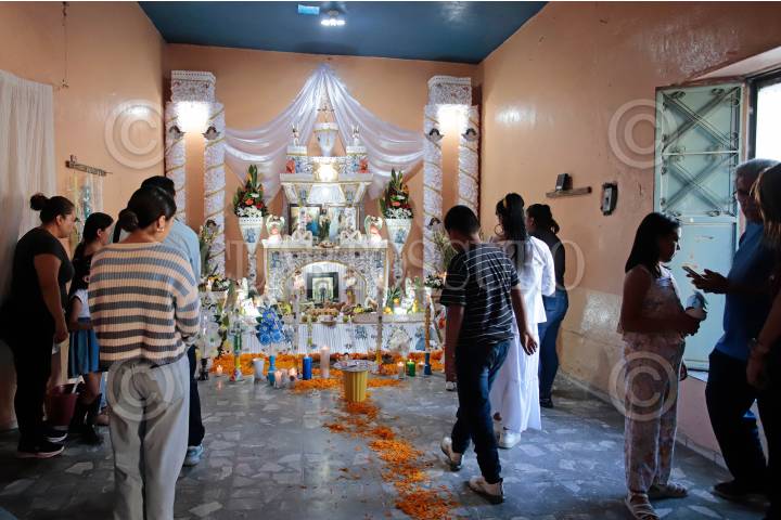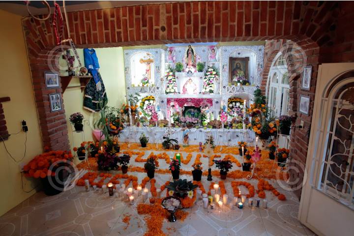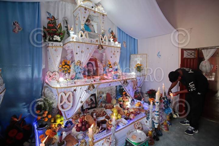 PUEBLA, PUEBLA, 01NOVIEMBRE2024.- Familias del municipio de Huaquechula colocaron los tradicionales altares monumentales que son visitados por decenas de personas. Las ofrendas constan de tres niveles: el primero representa el plano terrenal, en el segundo van los llorones, figuras de barro en forma de niños que representan a los dolientes y en el tercero se representa el cielo. MIREYA NOVO/ CUARTOSCURO.COM