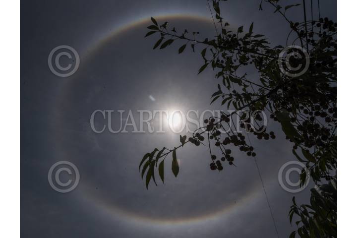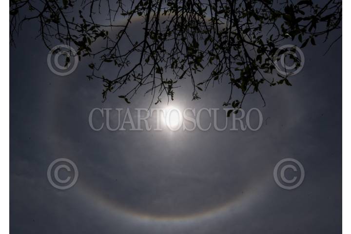 TOLUCA, ESTADO DE MÉXICO, 10 JULIO 2025.- En la capital mexiquense se pudo observar un halo solar, un fenómeno óptico, formando un anillo de luz alrededor del sol con colores similares al del arcoíris. Se registra por la refracción de luz solar a través de cristales de hielo en las nubes. FOTO: CRISANTA ESPINOSA AGUILAR/CUARTOSCURO.COM
