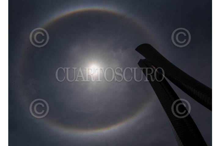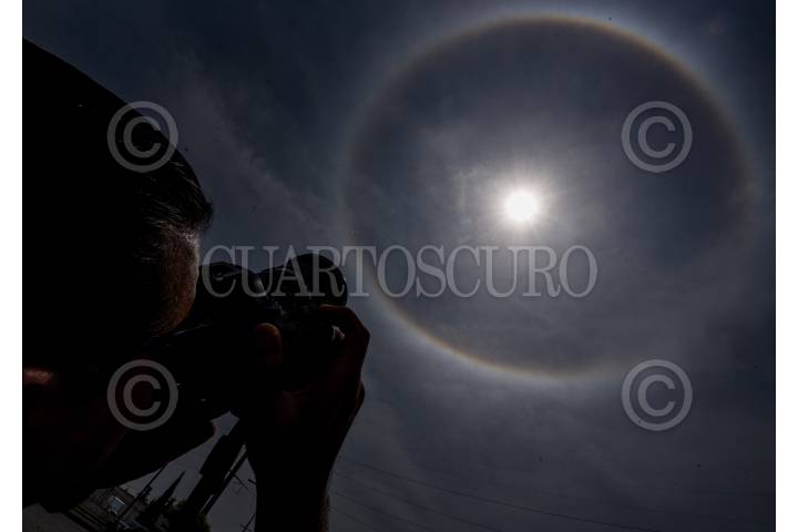 TOLUCA, ESTADO DE MÉXICO, 28MAYO2024.- Este día en la capital mexiquense pudo observarse un fenómeno óptico atmosférico conocido como halo solar, espectáculo que pudo verse en varios estados de la República Mexicana. FOTO: CRISANTA ESPINOSA AGUILAR /CUARTOSCURO.COM