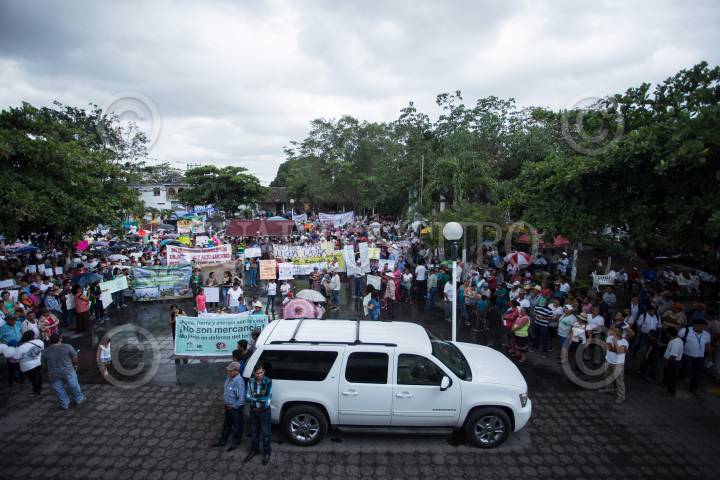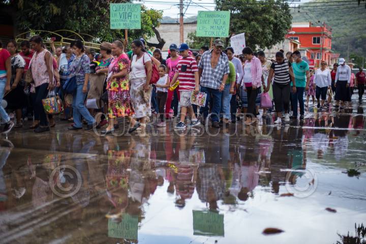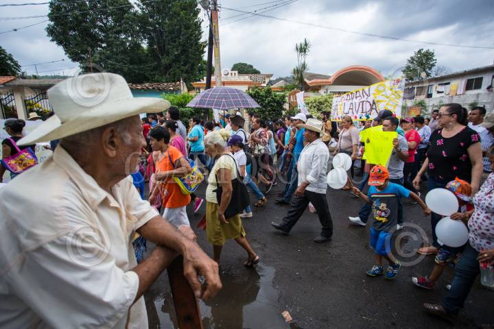 ACTOPAN, VERACRUZ, 08JUNIO2018.- Pobladores de comunidades de la sierra de Chiconquiac, en la costa centro del estado, se organizaron para enfrentar los proyectos mineros Caballo Blanco y El Cobre, de las compañías canadienses Almaden Minerals y Goldgroup, los cuales pretenden extraer oro a cielo abierto de la punta del cerro La Paila, ubicado a 3 kilómetros de la central nuclear de la CFE Laguna Verde. El pasado 25 de mayo, en el municipio de Actopan, en asamblea popular en el atrio de la parroquia de San Francisco de Asis y con el acompañamiento de los sacerdotes Andrés y Urbano, niños, jóvenes, mujeres, hombres y adultos mayores de los pueblos Mesa de 24, Los Baños, Villa Rica, Tinajitas, Cerro Gordo y Totolapa definieron los pasos para resistir y defenderse del plan de las empresas mineras. Tras informar de las consecuencias que la minería a cielo abierto a provocado en otros estados del país, los pobladores definieron defenderse y resistir de manera social, política y legalmente la reactivación de los proyectos que pretenden iniciar la explotación en julio “tras conseguir los permisos necesarios”, informó un vocero de la compañía. Después de realizar una marcha informativa por las principales calles del municipio y terminar con un mitin en la plaza Juárez, entre gritos “¡sí a la vida, no a la mina!”, “¡gritemos muy fuerte, la mina trae muerte!”, “¡en Veracruz queremos vivir, la mina se tiene que ir!”, las personas exigieron al presidente municipal, Paulino Domínguez Sánchez, su definición clara en apoyo a la comunidad y no otorgar el cambio de uso de suelo. Entre los permisos que las compañías mineras requieren para iniciar una explotación se encuentran dos fundamentales: una consulta a las comunidades que aprueben la explotación y el cambio de uso de suelo, que está en manos del cabildo y titular del municipio. México es uno de los lugares de mayor riqueza natural y mineral para la realización de proyectos mineros. De acuerdo con la Secretaría de Economía, México es el primer destino en inversión en exploración minera en América Latina y el cuarto en el mundo, lo cual contrasta con la situación que viven las principales zonas mineras del país: según investigaciones de la Fundar, Centro de Análisis e Investigación A.C., especies y recursos naturales están peligro de extinción, hay gente desplazada, crimen organizado y municipios y poblaciones dentro de los índices de mayor marginación y pobreza del país. FOTO: ADOLFO VLADIMIR /CUARTOSCURO.COM