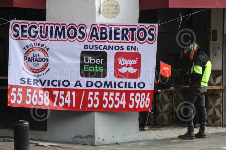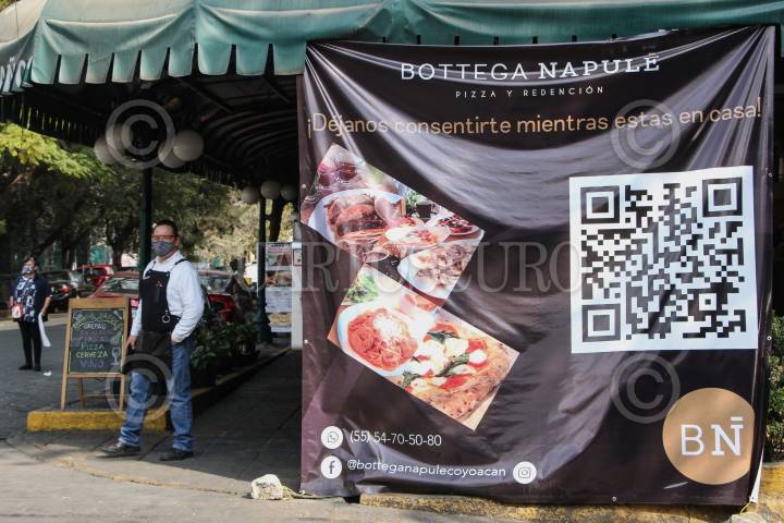 Código QR y meseros frente a local, restaurante busca segur sobreviviendo al semáforo rojo.