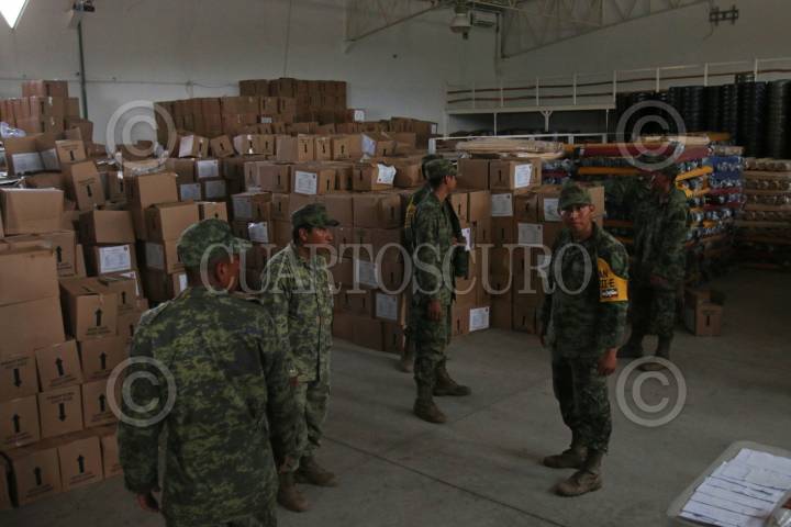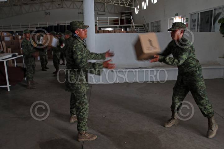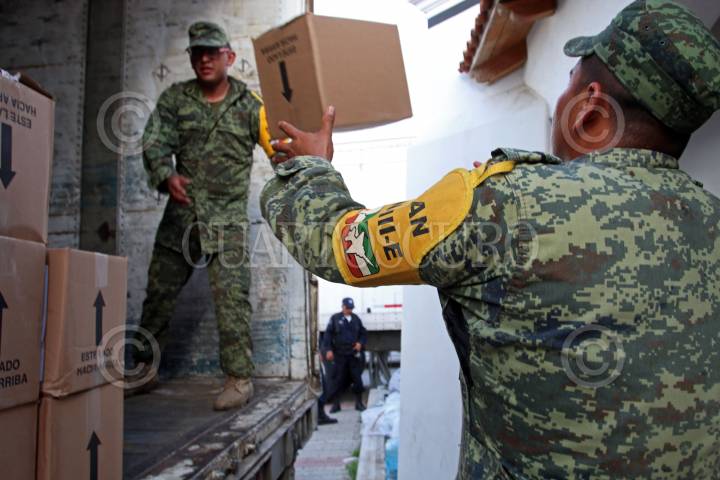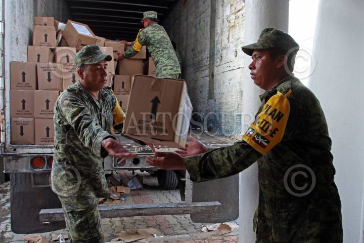 CIHUATLÁN, JALISCO. 25OCTUBRE15.-. En el poblado de el aguacate, municipio de Cihuatlán, Militares asignados al Plan DN-III, bajan víveres de los trailers que llegaron con el apoyo para los damnificados que fueron afectados por el Huracán Patricia que azoto la Costa alegre del estado. FOTO: FERNANDO CARRANZA GARCIA / CUARTOSCURO.COM
