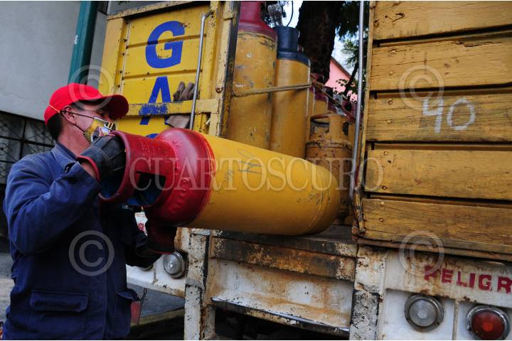 Un trabajador de Pemex baja del camión un cilindro de Gas Bienestar y que será entregado a un habitante de Iztapalapa.
