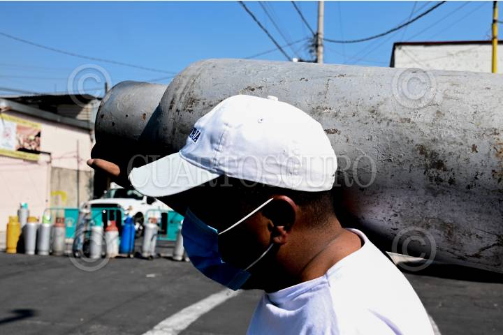 Un hombre carga un cilindro de Gas Bienestar de 20 kilos.