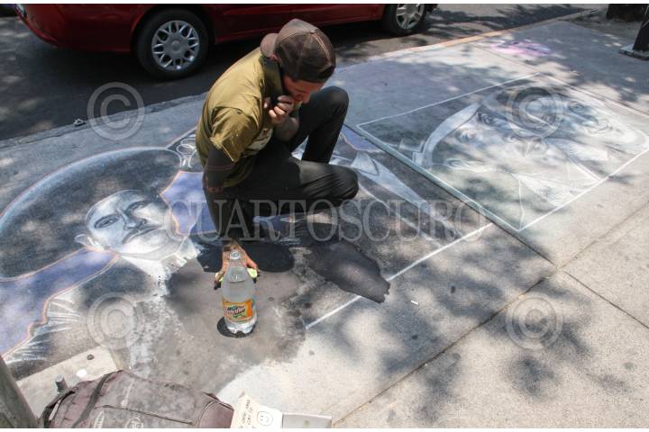 CIUDAD DE MÉXICO, 25ABRIL2019.- Artista callejero borra su trabajo plasmado en la banqueta de la calle, donde plasmo retratos de actores de la época del Cine de Oro. FOTO: ROGELIO MORALES /CUARTOSCURO.COM