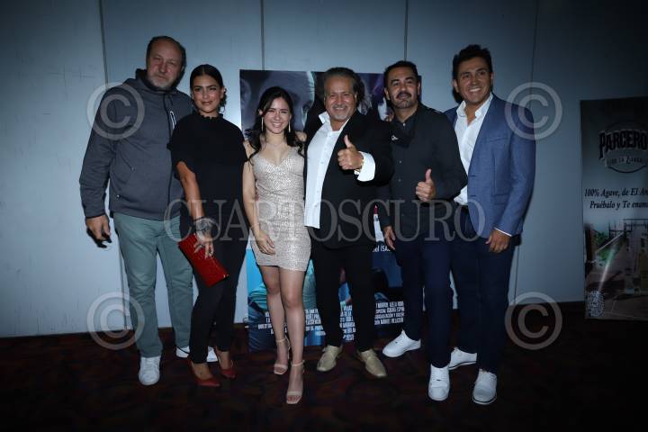 Los actores Rodrigo Murray, Liz Gallardo, Hania de la Vega, el director Manuel Villaseñor, Frank Rodríguez y el productor Rolando Ruíz durante la alfombra roja de la película “Inevitable”, en un cine de Paseo de la Reforma.