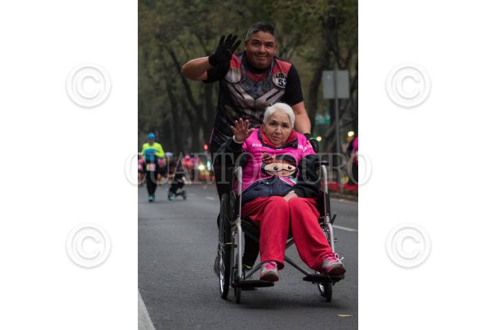Un hombre trota mientras acompaña a una mujer en silla de ruedas durante la segunda edición del Medio Maratón de la Mujer 2019, el cual se realizó sobre avenida Paseo de la reforma. FOTO: MAGDALENA MONTIEL /CUARTOSCURO.COM