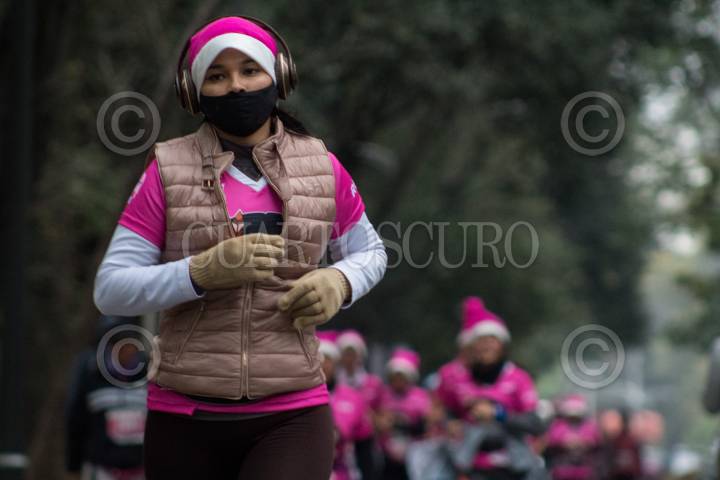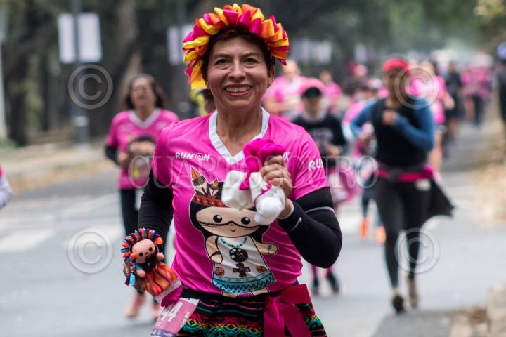 Una mujer con una muñeca de trapo en la mano trota durante la segunda edición del Medio Maratón de la Mujer 2019. FOTO: MAGDALENA MONTIEL /CUARTOSCURO.COM
