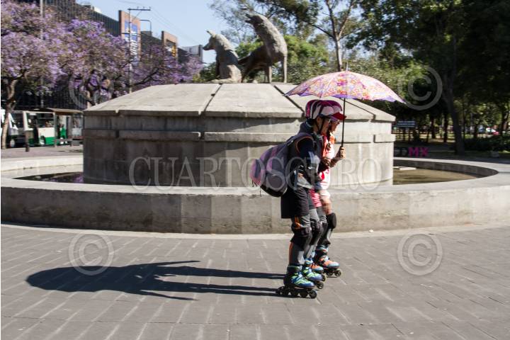 CIUDAD DE MÉXICO, 10ABRIL2019.- Dos mujeres patinan de manera sincronizada, mientras una de ella sostiene una sombrilla que las protege del intenso sol en el circuito Alameda Sur. FOTO: ROGELIO MORALES /CUARTOSCURO.COM