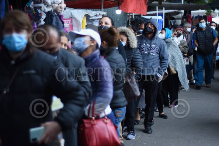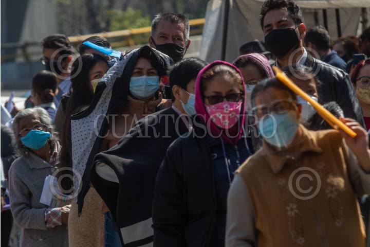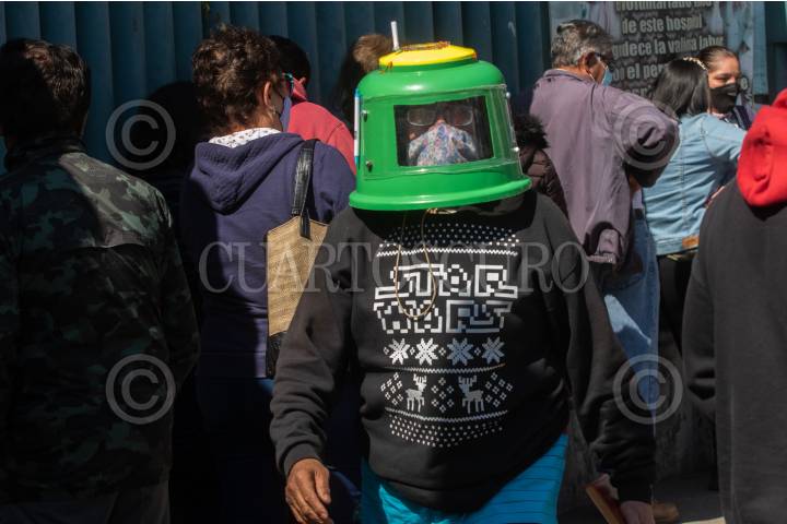Juan Julián Vilchis, de 64 años, inventó su casco protector contra el Covid-19, el cual esta construido con un garrafón, acrílica y la tapa de una botella de jerez. Largas filas se volvieron a presentar en el Hospital La Raza de derechohabientes que buscan atención médica en alguna de sus especialidades.