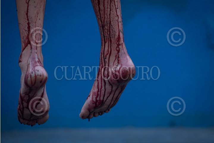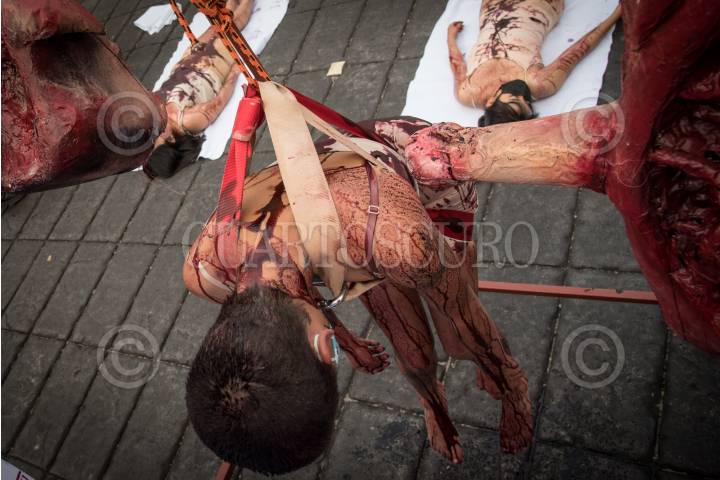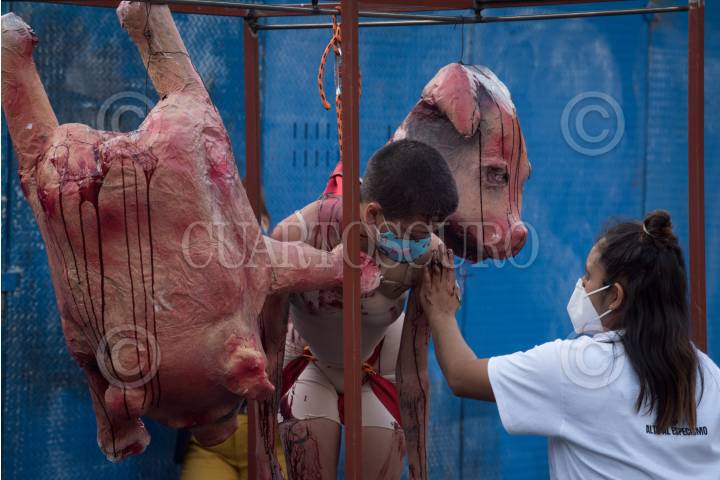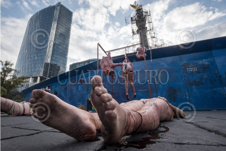 Integrantes de colectivos "Animal Save Movement" y "México sin matrato animal" realizaron un performance en la glorieta del Ángel de la Independencia para generar conciencia sobre el maltrato animal.