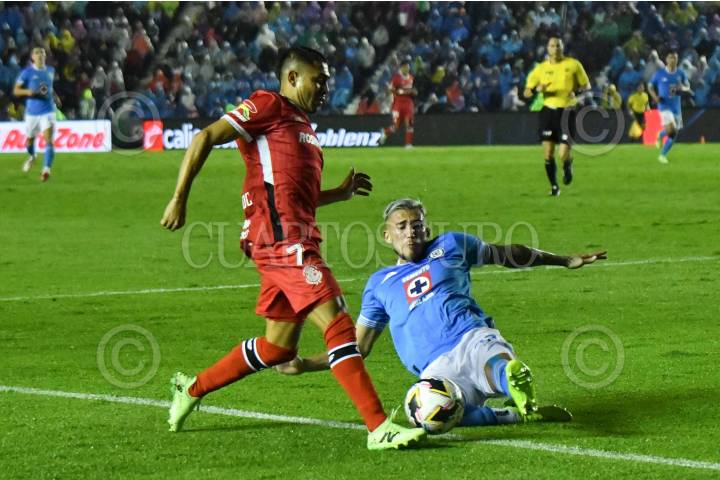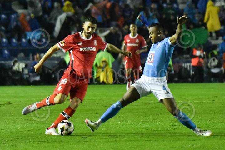 CIUDAD DE MÉXICO, 20JULIO2014.- Juan Domínguez, mediocampista de Toluca, frente a la marca de Gonzalo Piovi, defensa de Cruz Azul, durante el partido correspondiente a la jornada 4 del Torneo Apertura 2024 de la Liga MX llevado a cabo en el estadio Ciudad de los Deportes. FOTO: MARIO JASSO/CUARTOSCURO.COM