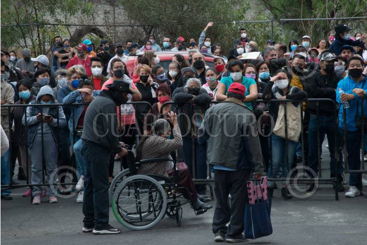 Adultos entre 50 y 60 años de edad esperan en fila en las inmediaciones del Palacio de los Deportes para poder recibir la vacuna de refuerzo contra covid-19.