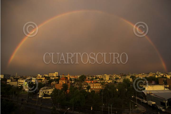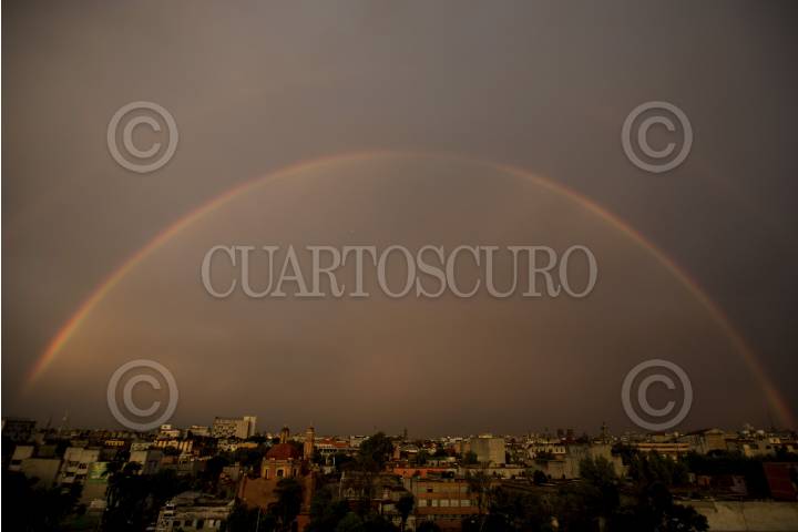 CIUDAD DE MÉXICO, 17MAYO2016.- Luego de una ligera lluvia se pudo aprecia el arcoiris en la ciudad que contrasto con los días contaminados que había vivido la capital. FOTO: LUIS MEJÍA /CUARTOSCURO.COM