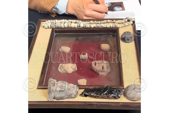 TUCSON, ARIZONA, 15MARZO2024.- El Consulado General de México en Tucson, Arizona, informó sobre la recuperación de 13 piezas arqueológicas, obtenidas mediante la restitución voluntaria que realizó una ciudadana estadounidense. De acuerdo con expertos del Instituto Nacional de Antropología e Historia (INAH), instancia de la Secretaría de Cultura federal, se determinó que estos bienes patrimoniales corresponden a culturas del Altiplano Central, las cuales fueron elaboradas durante los periodos Clásico mesoamericano (200-750 d.C.) y Posclásico mesoamericano (1200 d.C.-1521 d.C.). Destacan piezas de estilo teotihuacano, como una máscara miniatura y fragmentos de figurillas antropomorfas; así como una figurilla antropomorfa, de estilo mexica, la cual representa a un personaje femenino que porta un tocado, orejeras y quechquemitl (prenda formada por dos rectángulos unidos), y sostiene sobre su regazo a un infante. Además de un collar de cuentas esféricas y discoidales, elaboradas en roca metamórfica de coloración verdosa; un cuchillo bifacial y un par de malacates. FOTO: SECRETARÍA DE CULTURA/CUARTOSCURO.COM