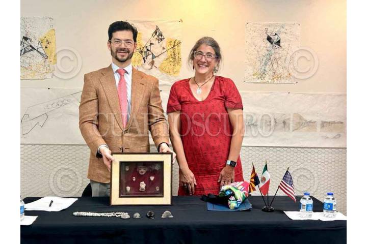 TUCSON, ARIZONA, 15MARZO2024.- El Consulado General de México en Tucson, Arizona, informó sobre la recuperación de 13 piezas arqueológicas, obtenidas mediante la restitución voluntaria que realizó Julie Qashu, ciudadana estadounidense. De acuerdo con expertos del Instituto Nacional de Antropología e Historia (INAH), instancia de la Secretaría de Cultura federal, se determinó que estos bienes patrimoniales corresponden a culturas del Altiplano Central, las cuales fueron elaboradas durante los periodos Clásico mesoamericano (200-750 d.C.) y Posclásico mesoamericano (1200 d.C.-1521 d.C.). Destacan piezas de estilo teotihuacano, como una máscara miniatura y fragmentos de figurillas antropomorfas; así como una figurilla antropomorfa, de estilo mexica, la cual representa a un personaje femenino que porta un tocado, orejeras y quechquemitl (prenda formada por dos rectángulos unidos), y sostiene sobre su regazo a un infante. Además de un collar de cuentas esféricas y discoidales, elaboradas en roca metamórfica de coloración verdosa; un cuchillo bifacial y un par de malacates. FOTO: SECRETARÍA DE CULTURA/CUARTOSCURO.COM