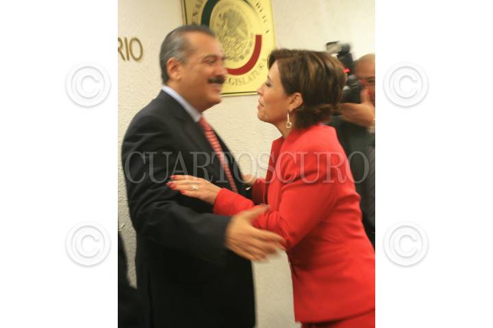 MÉXICO, D.F., 09FEBRERO2010.- Manlio Fabio Beltrones, coordinador de los senadores priistas y Rosario Robles, se encuentran y saludan efusivamente durante la entrega de una propuesta ciudadana impulsada por un grupo de mujeres destacadas que buscan se incluyan en la Reforma Política, impulsada por el Ejecutivo Federal. En estos momentos se esta analizando la misma en diferentes sectores políticos y ciudadanos. El encuentro se dio en las oficinas de la presidencia del PRI en el Senado. FOTO: MOISÉS PABLO/CUARTOSCURO.COM